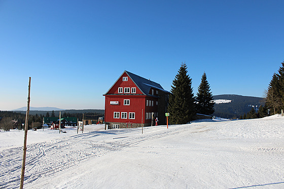 Stoupám na Liščí horu, odkud je výhled na Sněžku přes údolí s Pecí úplně nejhezčí. Zakotvuji v oblíbeném podniku Bufet Na Rozcestí, který je i ve snobských Krkonoších pořád hodně lidový.