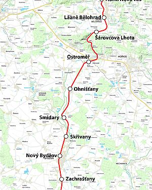 Za Ostroměří se noříme do hlubokého a opuštěného údolí Javorky. Trať se jím poměrně klikatí. Sotva se z údolí vymaníme, je tu stanice Lázně Bělohrad. Kromě léčebných pramenů a lesoparků, které vybízejí k dlouhým procházkám, můžete navštívit také Památník spisovatele Karla Václava Raise. Muzeum zoologa a paleontologa Antonína Friče je bohužel dlouhodobě uzavřené.