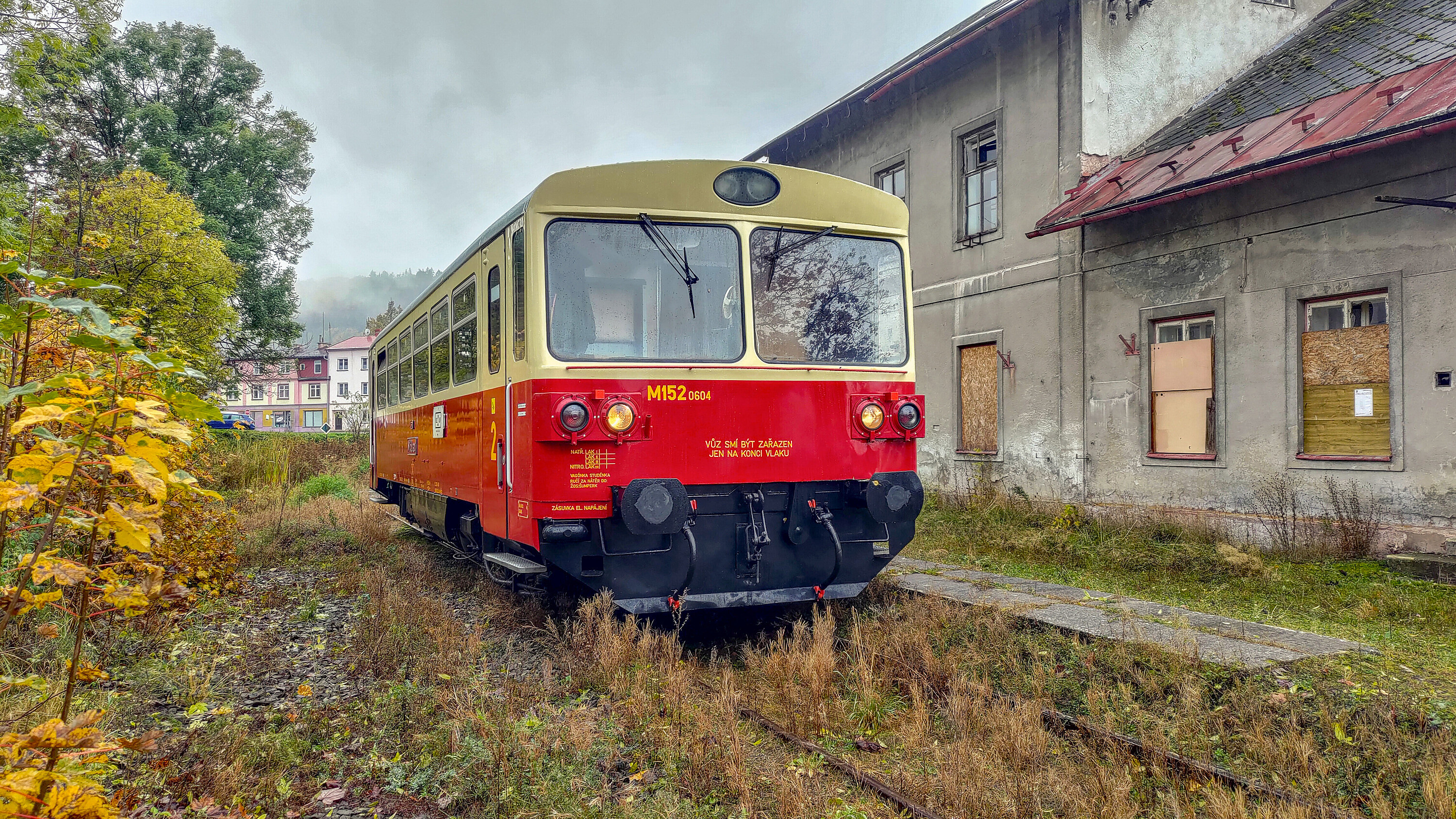 Pokračujeme k cíli, těsně před Žacléřem se nám otevřou výhledy na Krkonoše, resp. Rýchory. Žacléřské nádraží leží hned na začátku města, do centra je to ještě kilometr a půl. Staniční budova je v tuto chvíli opuštěná, dřevěná přístavba skladiště vzala před lety za své, koleje kromě jedné byly vytrhány, peron není pod trávou ani vidět. Motorák M152.0604 Kolej-klubu ve stanici vypadal skoro ztraceně, ale snad se celému nádraží blýská na lepší časy.