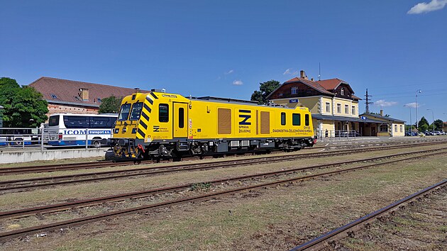 Protože musí žlutá měřící drezína EM 100 Správy železnic proměřit celou trať, vydáváme se ze stanice Slavonice až za odjezdová návěstidla směrem na Schwarzenau. Před prvním obloukem nás ovšem zastavuje červený terč a nesjízdná trať, přitom by stačilo jen pár set metrů a byli bychom na hranicích.