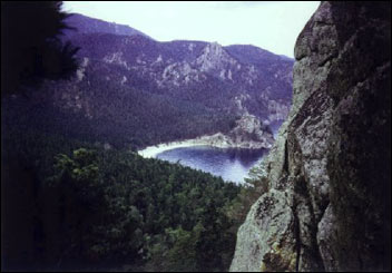 Na obzoru se vynořila malá tečka, rybářská bárka. Míří podél břehů majestátních kopců pohoří Sviatoj Nos, které se zvedá přímo z vodní hladiny naproti.