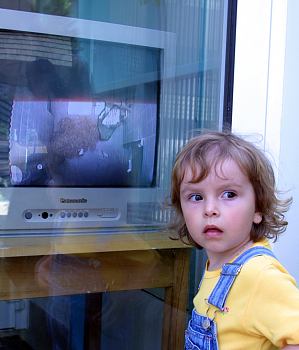Holčička sleduje v liberecké ZOO bílé tygry na TV obrazovce. |