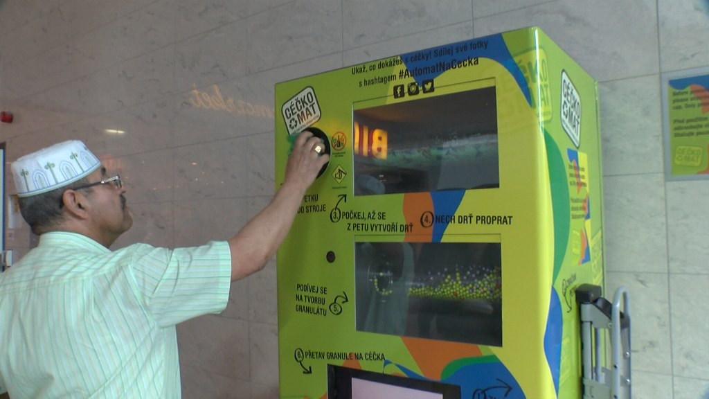 Princip je jednoduchý. Prázdnou lahev nejdřív ručně slisujete, následně otvorem vložíte do céčkomatu, který vám z každé prázdné lahve vrátí hrst zrecyklovaných céček. Na Letišti Václava Havla se v něm denně vytřídí asi 800 PET lahví, přičemž automat rozdělí jako bonus několik tisíc céček.