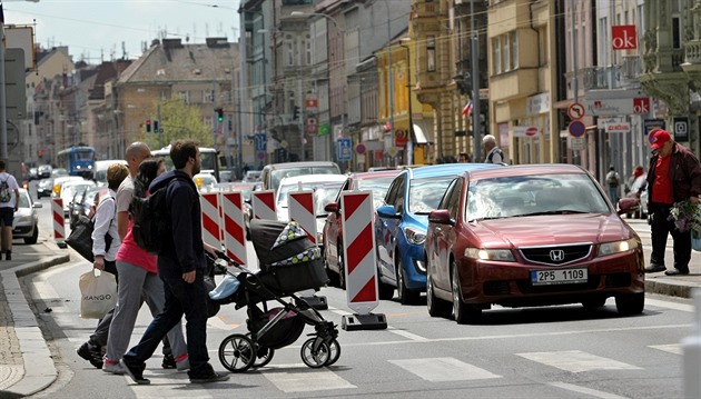Zúžení Klatovské třídy v Plzni kvůli opravám vodovodního řadu komplikuje dopravu v centru města. (9. 5. 2016)