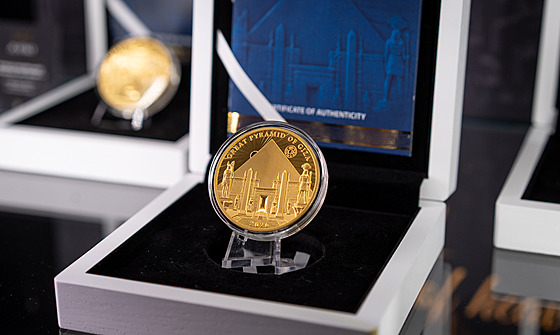 Zlatá mince o váze 100 g a ryzosti 999,9/1000 vzdává hold nejstaršímu a dodnes jedinému dochovanému divu starověkého světa. Celosvětová limitace činí pouhých 47 kusů pro celý svět.
