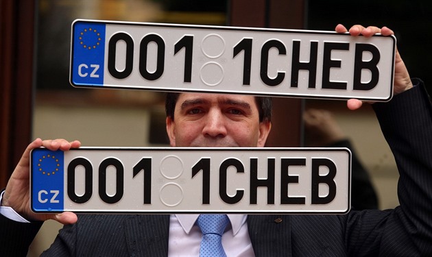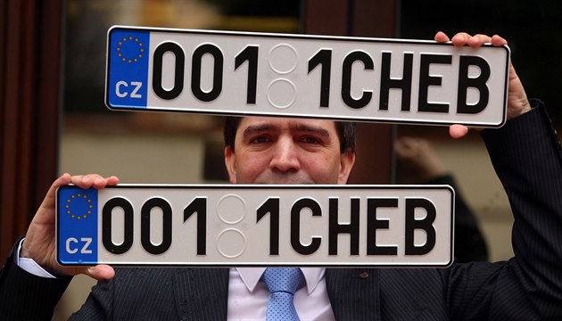 Chebský starosta Petr Navrátil ukazuje nové registrační značky, kterými budou označeny městské automobily. |