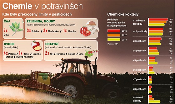 Problém je, že přibývá případů, kdy je pesticidů, kterých jsou celkově zkoumány asi čtyři stovky, nalezeno vícero. Z tabulek Státní zemědělské a potravinářské inspekce za loňský rok vyplývá, že zatímco nálezů, kdy šlo o jeden či dva pesticidy, ubývá, když jde o tři a více, jejich počty narůstají. Výjimkou nejsou ani potraviny, kde byly nalezeny zbytky více než dvaceti druhů pesticidů. Počet vzorků s více než osmi nálezy se loni proti předešlému roku více než zdvojnásobil.