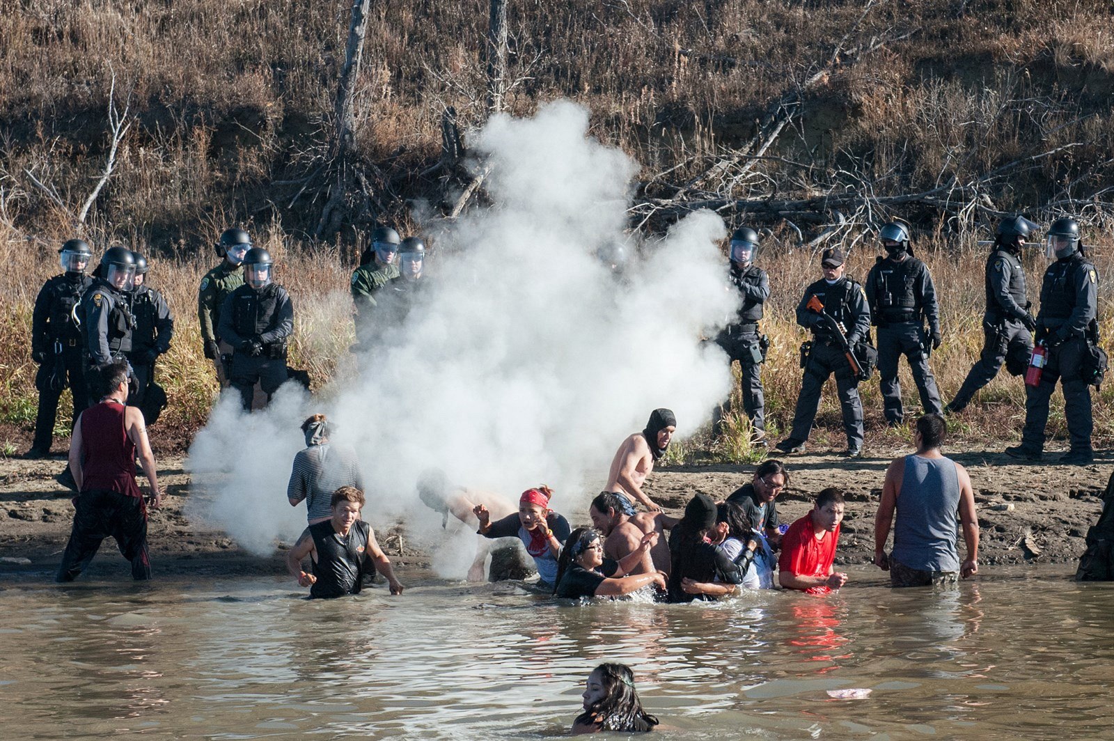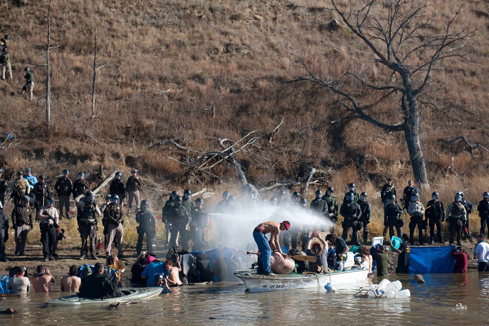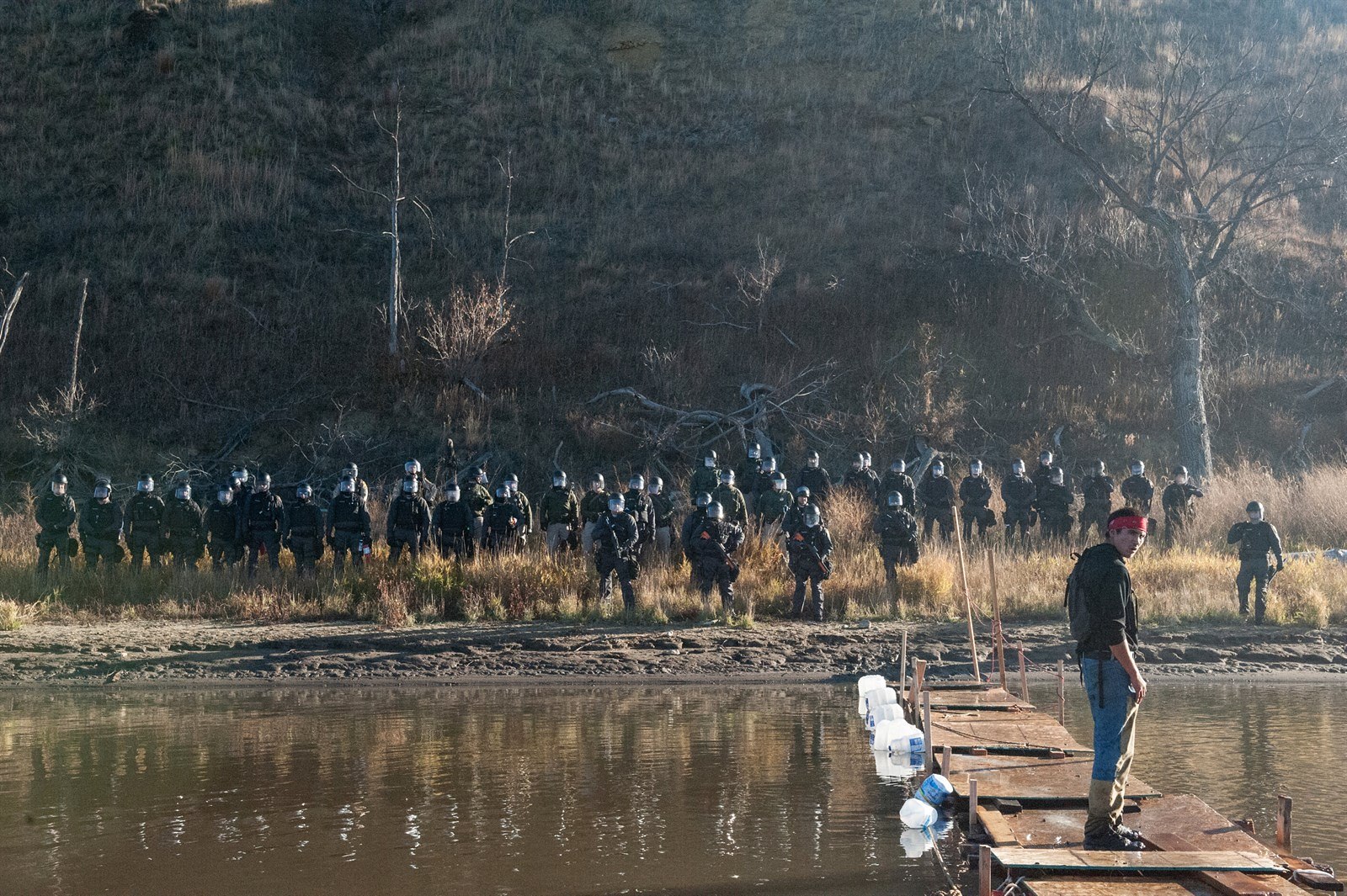 Stavební společnost pak vyzvala místního šerifa, aby zabránil demonstrantům ve vniknutí na soukromý pozemek, kde probíhá stavba. Protestující se přesto pokusili přeplavat řeku Cannonball tvořící hranici parcely.