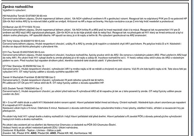 Kromě popsané inzultace ve zprávě rozhodčích naleznete také záznam o vykopnutých dveřích v kabině, divácích na hrací ploše, příjezdu policie nebo ošetření obou asistentů v nedaleké chomutovské nemocnici.
