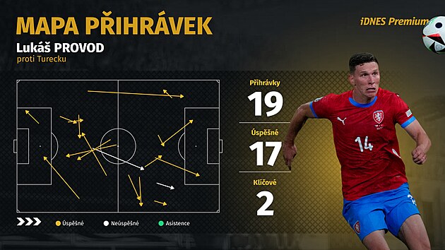 Těžko mohl udělat víc. S míčem si rozuměl, šikovně otáčel hru, vypomáhal na krajích a zkoušel i nabídky do vápna, podstoupil dost nepříjemných soubojů. Oběhat toho najednou musel o to víc, když už od dvacáté minuty Češi hráli bez vyloučeného Baráka.