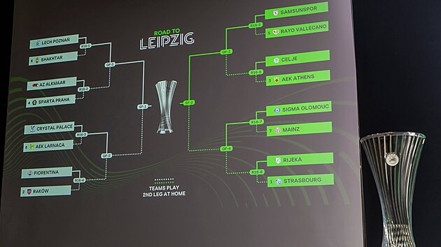 Los osmifinále Konferenční ligyZapsán podle dvou polovin pavouka Fiorentina (Itálie) - Raków Čenstochová (Polsko) Crystal Palace (Anglie) - Larnaka (Kypr) / Lech Poznaň (Polsko) - Šachtar Doněck (Ukrajina) Alkmaar (Nizozemsko) - SPARTA PRAHA ------------------------------------------------------------ Celje (Slovinsko) - AEK Atény (Řecko) Samsunspor (Turecko) - Rayo Vallecano (Španělsko) / SIGMA OLOMOUC - Mohuč (Německo) Rijeka (Chorvatsko) - Štrasburk (Francie) Pozn.: Vítězové dvojic zapsaných přímo pod sebou se střetnou ve čtvrtfinále, postupující z nich se v semifinále střetnou s týmy oddělenými lomítky. Týmy oddělené přerušovaně se potkají nejdříve ve finále. |