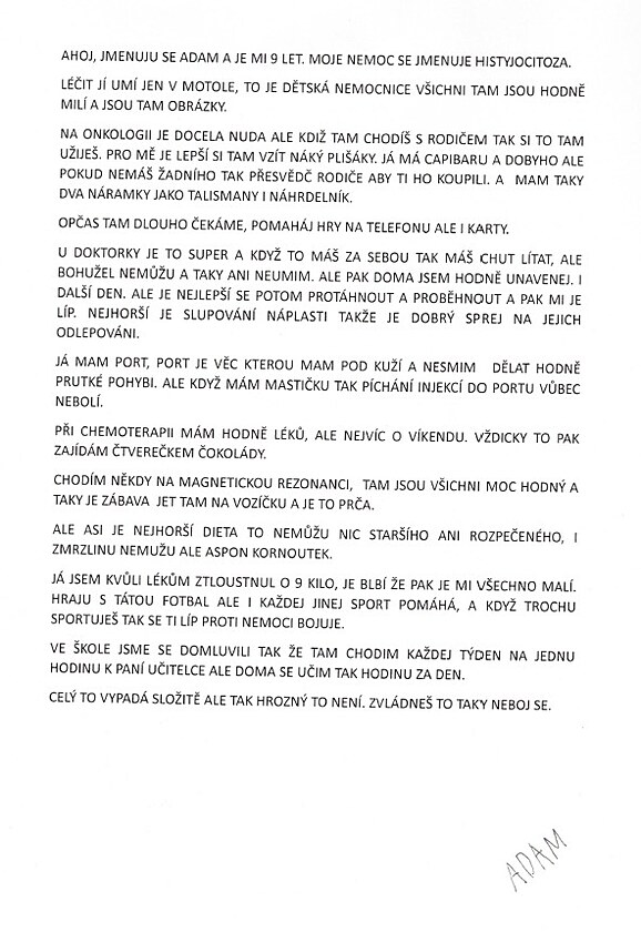 Poté docházel přes půl roku na chemoterapii. Pod klíční kostí má podkožní žilní port. „Nesmím dělat prudké pohyby. Ale když mám mastičku, tak píchání injekcí do portu vůbec nebolí,“ napsal v dopise dalším dětem, malým velkým bojovníkům s onkologickým onemocněním.