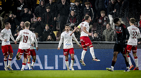 Míč z přímého kopu Samuela Šimka nejdřív tečoval do sítě ve zdi Albion Rrahmani. Jeden z prvních pak přibíhal k reklamním stojanům Krobot, který se hrdinsky bil do prsou. Euforie hostů byla pochopitelně za stavu 0:3 obrovská.