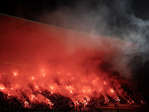 Slávisté měli v hledišti podle očekávání převahu, při nástupu hráčů se prezentovali obřím choreem i pyrotechnikou, která na pár minut přidusila celou tribunu. Jenže po rozplynutí červeného dýmu se hostující fanoušci rozhodně nebavili.
