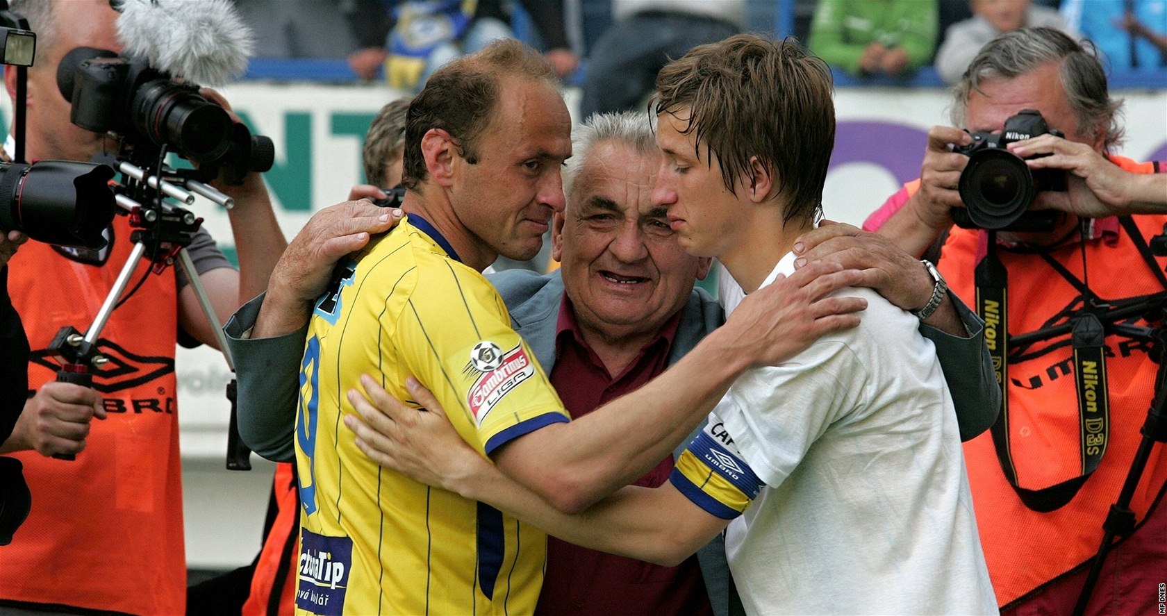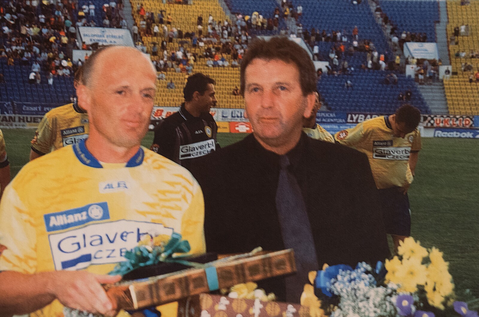 ROZLOUČENÍ. Michal Bílek a trenér Josef Pešice po posledním zápase sezony 1999/2000. První se loučil s hráčskou kariérou, druhý s Teplicemi. Nakonec se Bílek na Stínadla vrátil, odstartoval zde svoji trenérskou dráhu.