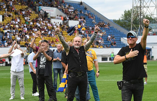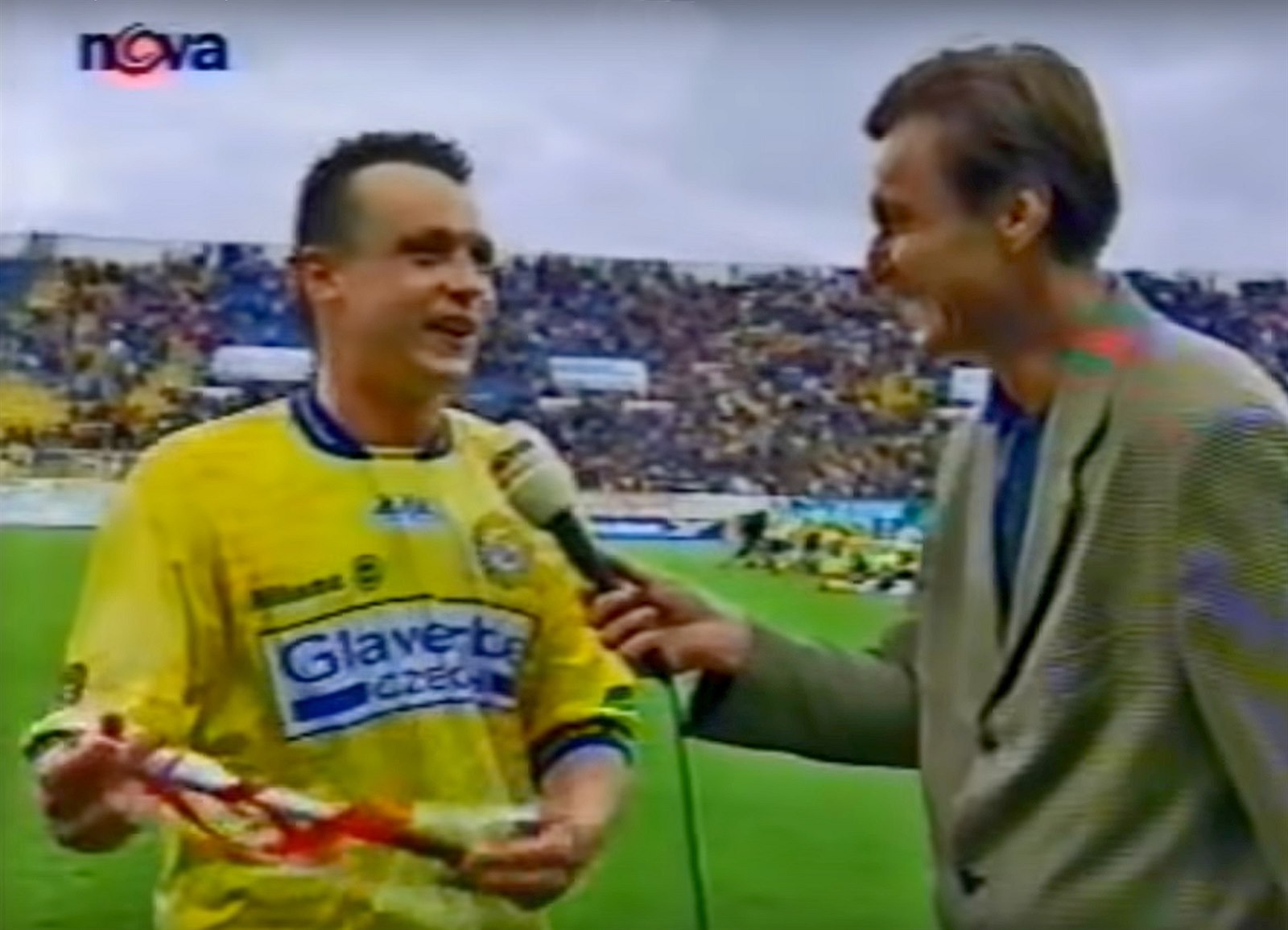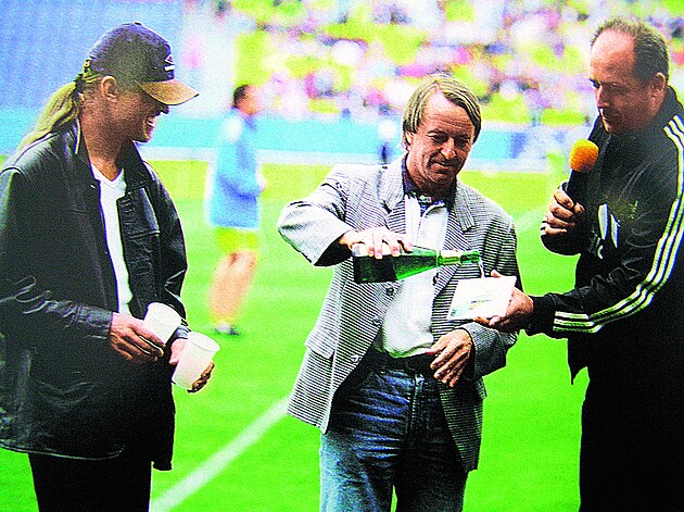 HYMNA. Křest teplické hymny Žlutomodrá, léto 1999 před utkáním kvalifikace o Ligu mistrů s německým Dortmundem. Zleva její autor Kamil Střihavka, legendární fotbalista Přemysl Bičovský a moderátor Petr Salava. Zpěvák Střihavka po letech přiznal, že hymna se nepovedla a nechytila.