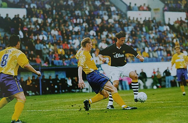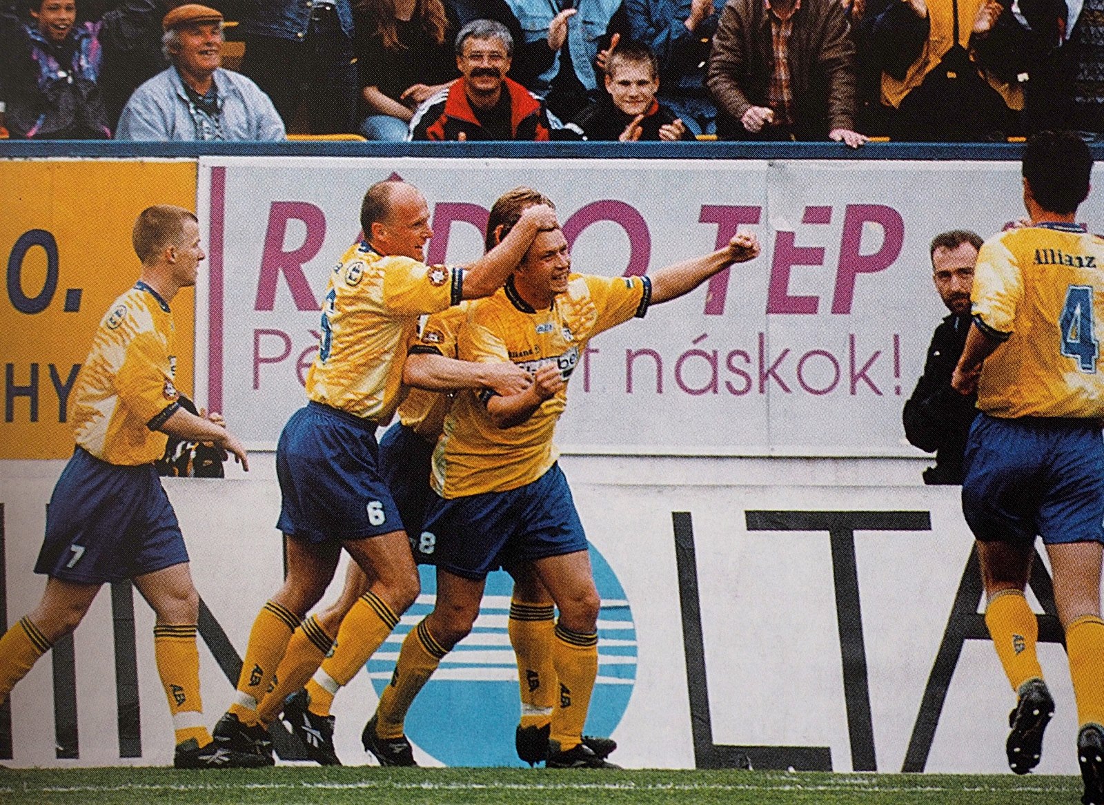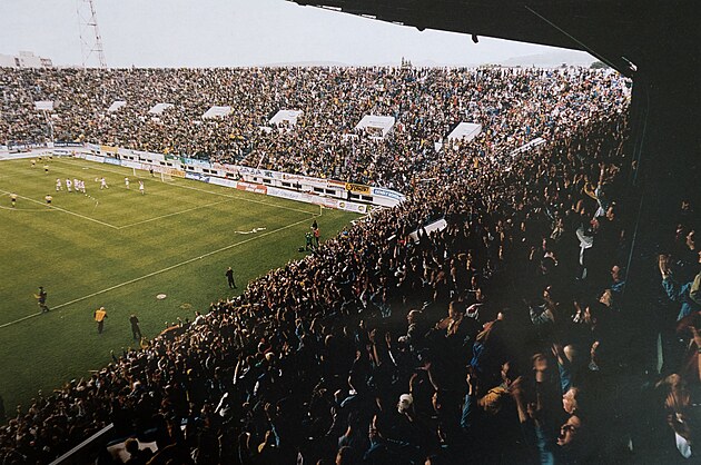 HISTORICKÝ ZÁPAS. Šlágr ligy s pražskou Slavií, vyprodaná (a ještě ne zcela zastřešená) Stínadla, finiš sezony 1998/99. Teplice otočily na 3:1 a slavily historické stříbro, lepší byla tehdy už jen Sparta.