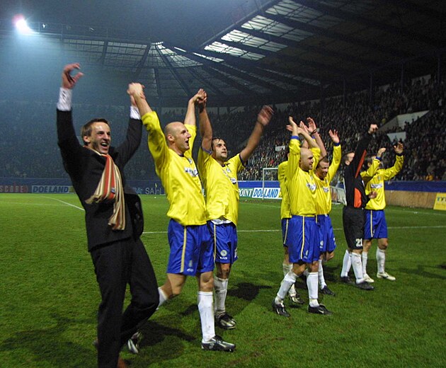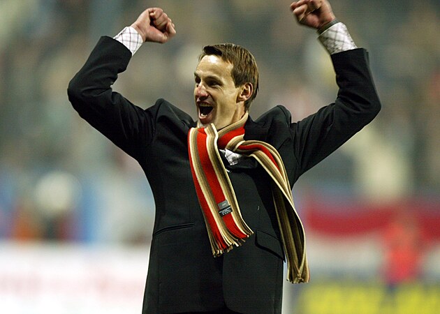EXTÁZE. Pohár UEFA 2003/04, Teplice - Feyenoord Rotterdam. Domácí slaví výhru 2:0 po gólech Horvátha a Rezka, vpředu trenér František Straka.