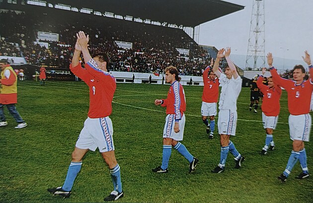 DOMOV REPREZENTACE. Česká reprezentace si teplická Stínadla oblíbila. Když v kvalifikaci o Euro 1996 porazila Maltu 6:0, divákům děkovali Kuka, Verbíř, Němec, Suchopárek, Frýdek a Kubík (zleva).