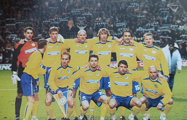 U SKOTŮ. Teplický tým před zápasem Poháru UEFA 2003/04 na hřišti Celtiku Glasgow. Horní řada zleva Poštulka, Ryška, Rada, Mareš, Hunal, Tesařík, dolní řada zleva Doležal, Verbíř, Kowalík, Skála, Leitner. Venku skláři prohráli 0:3, doma po gólu Maška zvítězili 1:0.