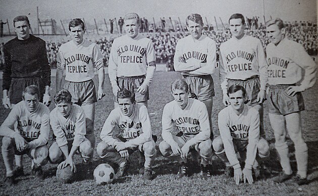 SKLÁRNA POPRVÉ. Aby nedošlo k mýlce, sklárna si vzala teplický fotbal pod křídla už za komunismu. Podporovala ho mezi lety 1965 a 1990. Na snímku teplický tým z roku 1965, kdy zanikl název Slovan a vznikl Sklo Union. Před vyprodaným hledištěm zleva stojí Sedláček, Dočkal, Myslivec, Malina, Kirth, Holomoj, dole zleva Stibor, Smetana, Grund, Kopecký a Setínský. V ligovém ročníku 1965/66 obsadili skláři 11. místo.