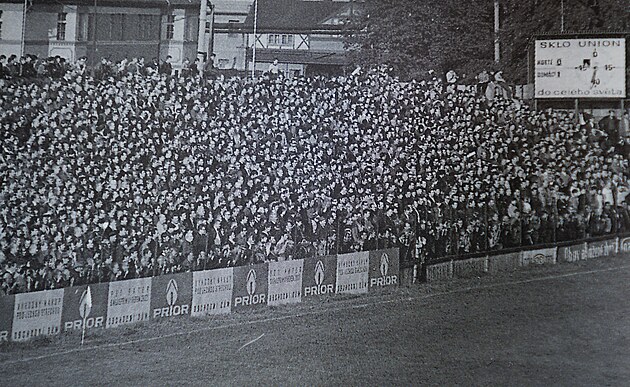 DROŽĎÁRNA. Fotbalové Teplice se spojily s místní sklárnou ještě v době, kdy hrály na staré Drožďárně. Dosvědčuje to i časomíra s reklamou na Sklo Union. Hlediště bývalo našlapané a hráči na kontakt s diváky.