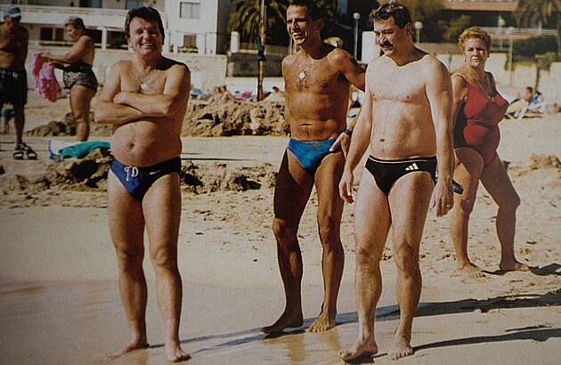 POHODA. Siesta u moře na Mallorce, kde Teplice hrály v roce 1999 zápas Poháru UEFA. Zleva trenér Josef Pešice, doktor Jan Bartsch a asistent trenéra Petr Němec.