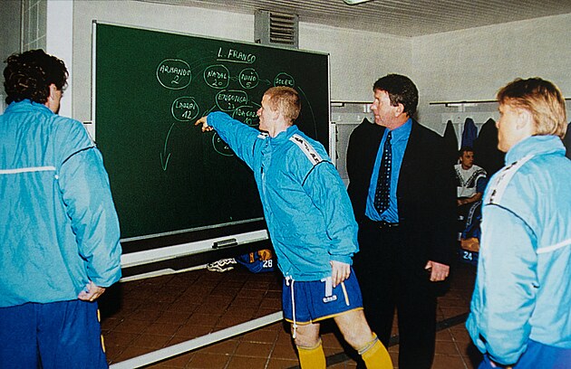 POHÁR UEFA. Když nevyšla Liga mistrů, Teplice se přesunuly do Poháru UEFA. Pohled do šatny při přípravě na Mallorku v roce 1999. Na tabuli se sestavou soupeře ukazuje Dušan Tesařík, vedle něj trenér Josef Pešice, kolem Martinové Jindráček a Frýdek. Skláři po výsledcích 1:2 a 0:3 vypadli.