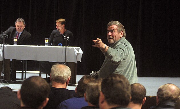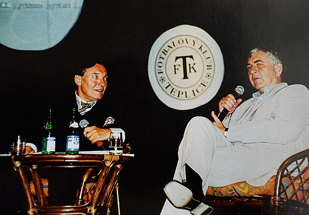 GATULANTI. Fotbalovým Teplicím gratulovaly k 55. výročí i hvězdy umělecké scény Karel Gott (vlevo) a Miroslav Donutil, psal se rok 2000 a Krušnohorské divadlo bylo vyprodané.