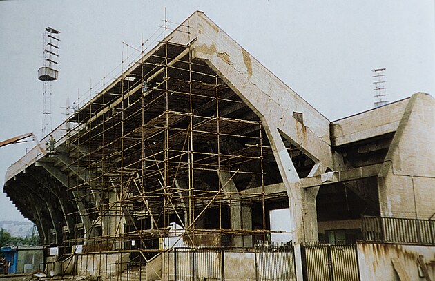 RUINA. Pod sklárnou klub zase rozkvetl a v roce 1996 se pustil do rekonstrukce Stínadel, otevřených víc než dvě dekády předtím. Zub času se na nich podepsal. Na snímku ještě staré stožáry umělého osvětlení.