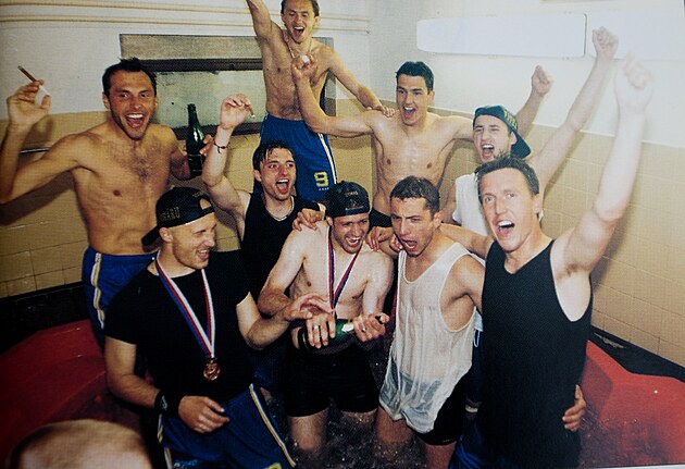 ŠAMPUS. Oslava vítězství v Poháru ČMFS v sezoně 2002/03 v šatně. Dole zleva Zelenka, Voříšek, Skála, Gross, Doležal, nahoře zleva Lengyel, Verbíř, Vlasák, Rilke.