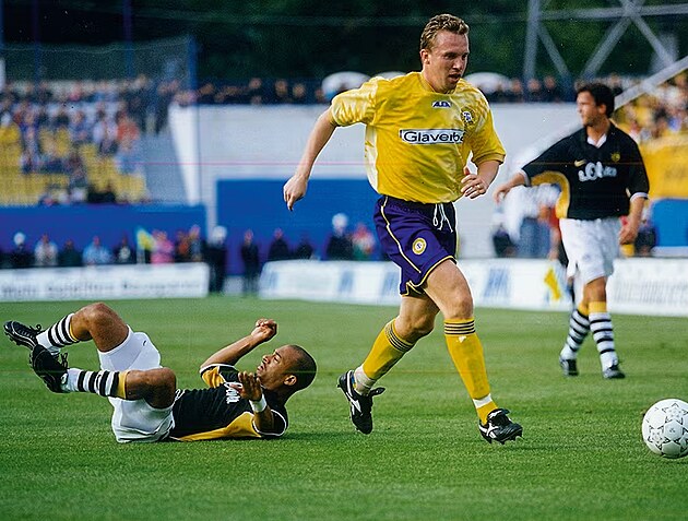 POHÁR UEFA. To byla jízda! Teplice v sezoně 2003/04 vyřadily nejprve Kaiserslautern, pak Feyenoord Rotterdam, tedy dva slavné kluby. Zastavil je až neméně slavný Celtic Glasgow. Na snímku kapitán Pavel Horváth v akci, mezi ním Schrueder a Shinji Ono z Feyenoordu.