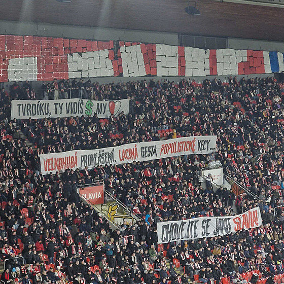 „Tvrdíku, ty vidíš peníze, my červenobílé srdce,“ objevilo se na prvním ze tří transparentů. Na dalších dvou ještě stálo: „Velkohubá prohlášení, laciná gesta, populistické kecy... Chovejte se jako Slavia!“