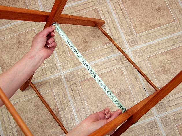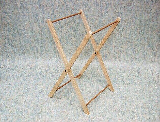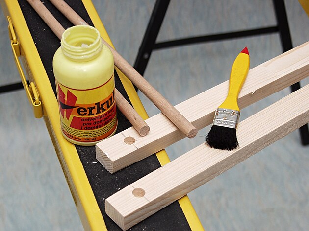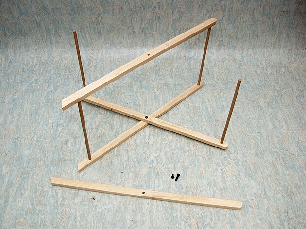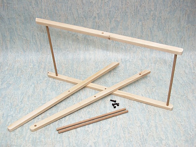 Budete potřebovat: 4 kusy kulatinky (týbl), průměr 10 mm , délka 40 cm, 4 ks dřevěné laťky, 2×3 cm, délka 80 cm. 2 větší spojovací šrouby, lepidlo, barva nebo lazura na povrchovou úpravu, látka na potah, kovové druky (možno nahradit velkými patenty). Laťky zakrátíme na délku 80 cm, označíme místa pro spojení šroubem v polovině latěk a pro vložení týblů – z jedné strany 3 cm, z opačné strany 5 cm od konce.