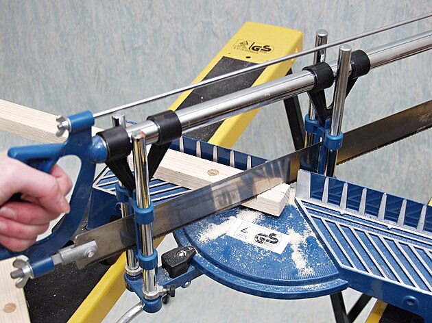 Na pokosové pile (nebo pomocí přesného měření a ruční pilkou) si zakrátíme vždy jednu stranu laťky v úhlu 60° – jedná se o stranu s otvory pro týble v 5cm vzdálenosti od kraje.