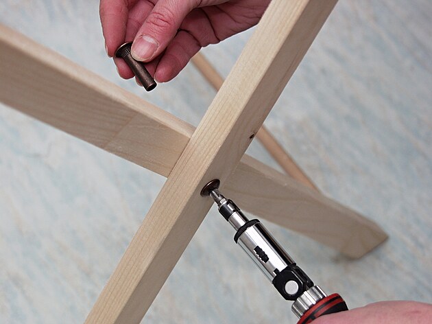 Konstrukci postavíme na zem a vyzkoušíme, jestli nožky dobře stojí a šroub není ani moc ani málo utažený, pak konstrukci natřeme bezbarvým lakem nebo barevnou lazurou.