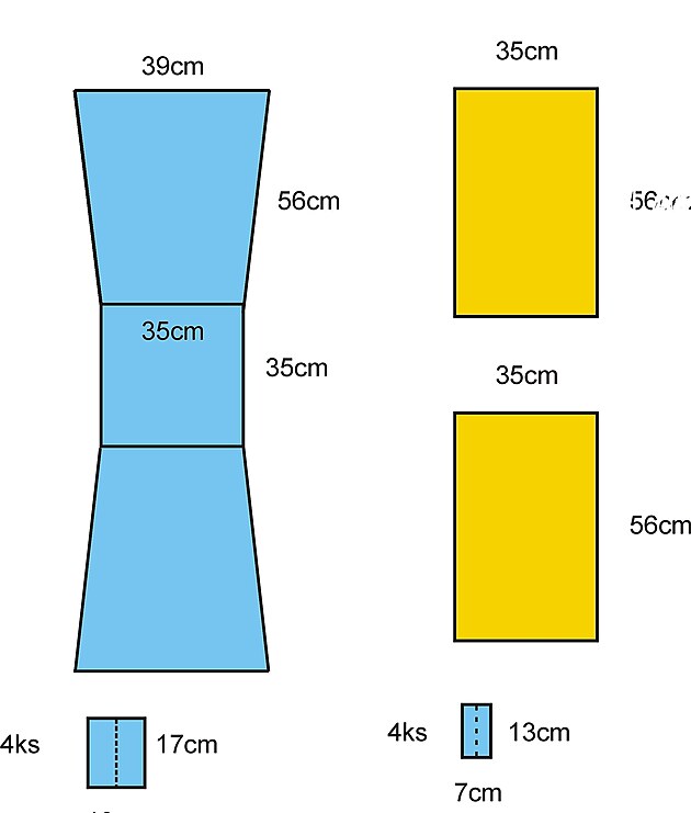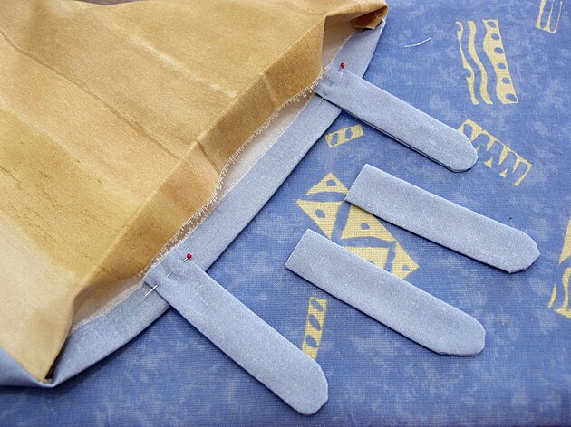 Ze čtyř proužků o velikosti cca 13×7 cm a čtyř proužků o velikosti cca 13×7 cm sešijeme po rubu tunýlky. Sešité proužky na poutka obrátíme na líc.