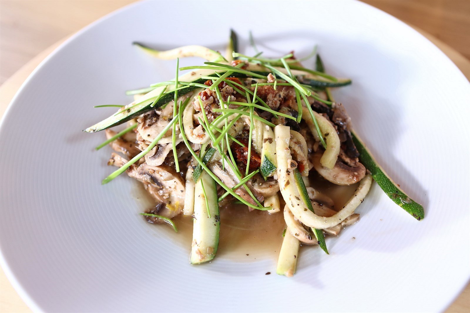 Šéf zvolí kombinaci s houbami, které lze restovat nebo marinovat, případně k cuketovým nudlím zkombinovat obojí jako v tomto receptu. Co se výběru hub týká, zařiďte se podle sezony: v létě či na podzim klidně použijte hříbky, mimo sezonu třeba i hlívu, která je k dispozici kdykoliv během celého roku.