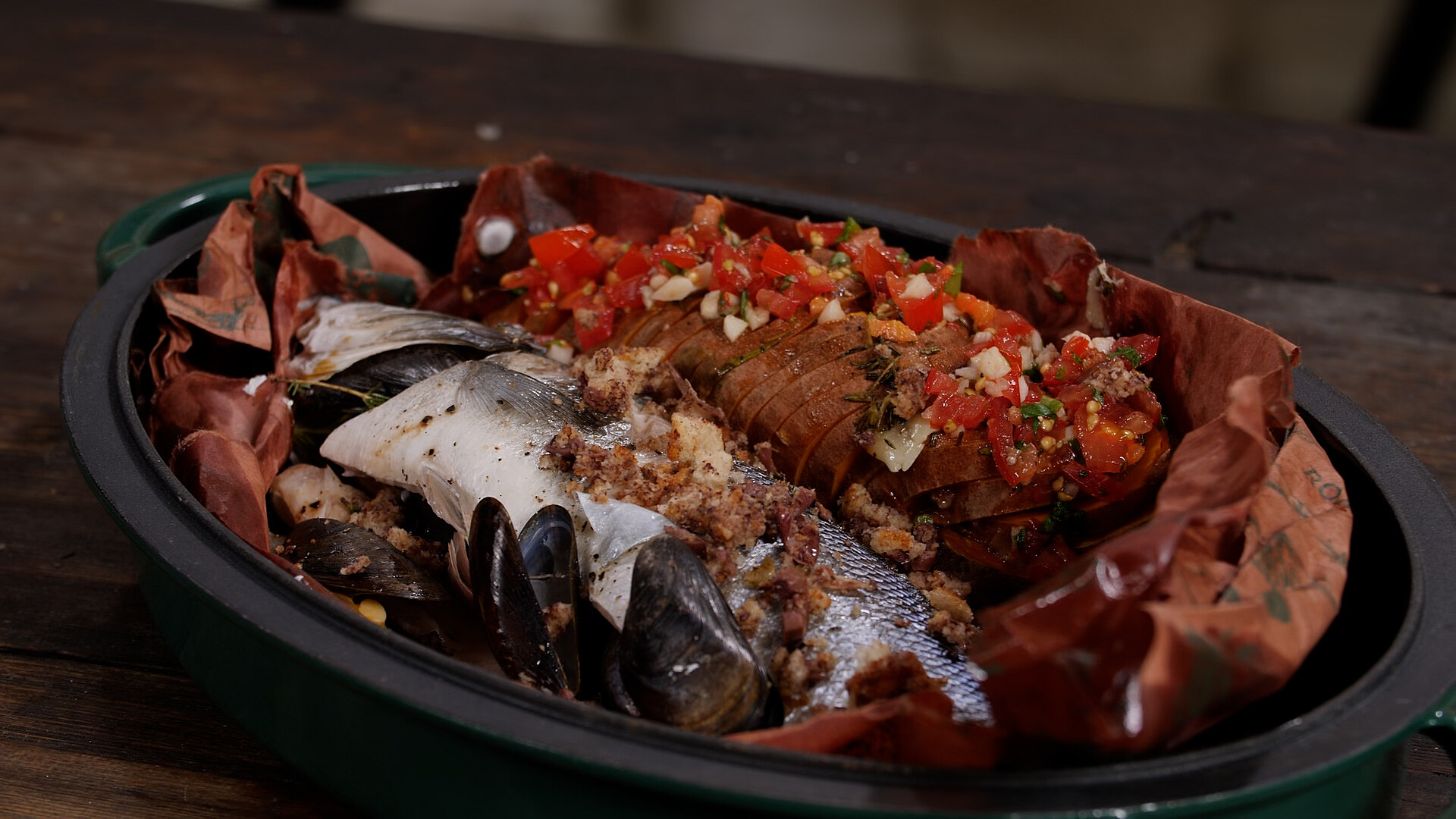 Rybu v papilotě vyndejte z grilu, uprostřed roztrhněte a nechte v papíru, ve kterém je hodně šťávy. Přidejte ogrilovanou batátu a na ni nandejte rajčatovou salsu i s trochou rajčatové šťávy, rybu nakonec posypte krustou z oliv.