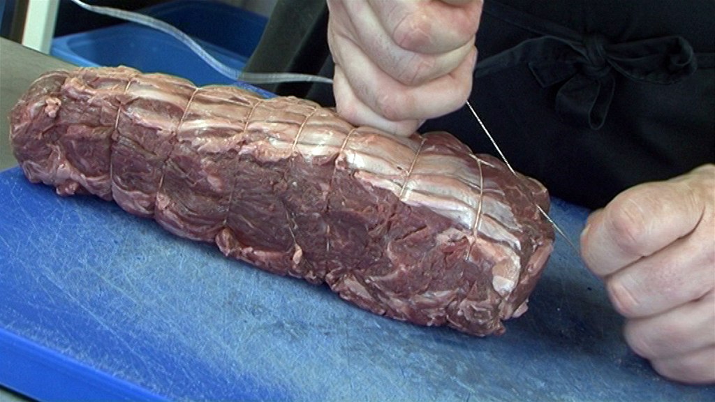 Nejprve pečeni nebo roládu zformujte tím, že provázek podtáhnete pod masem a zavážete. Potom mírně našikmo obmotávejte závit za závitem k druhému konci. Ale před každou další otáčkou si ho přidržte, aby se nepovoloval. Až se dostanete ke konci, pokračujte křížem zpět. Na konci provázek zavažte.