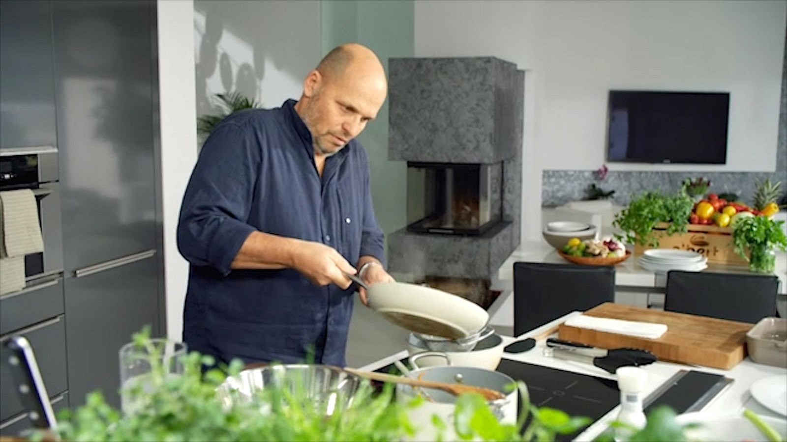 Pak je potřeba vzniklou směs vařit a redukovat. Aby to šlo šéfkuchaři lépe, přelil směs z rendlíku do pánve, kde je větší odpar. Nakonec omáčku zcedil a bylo hotovo.