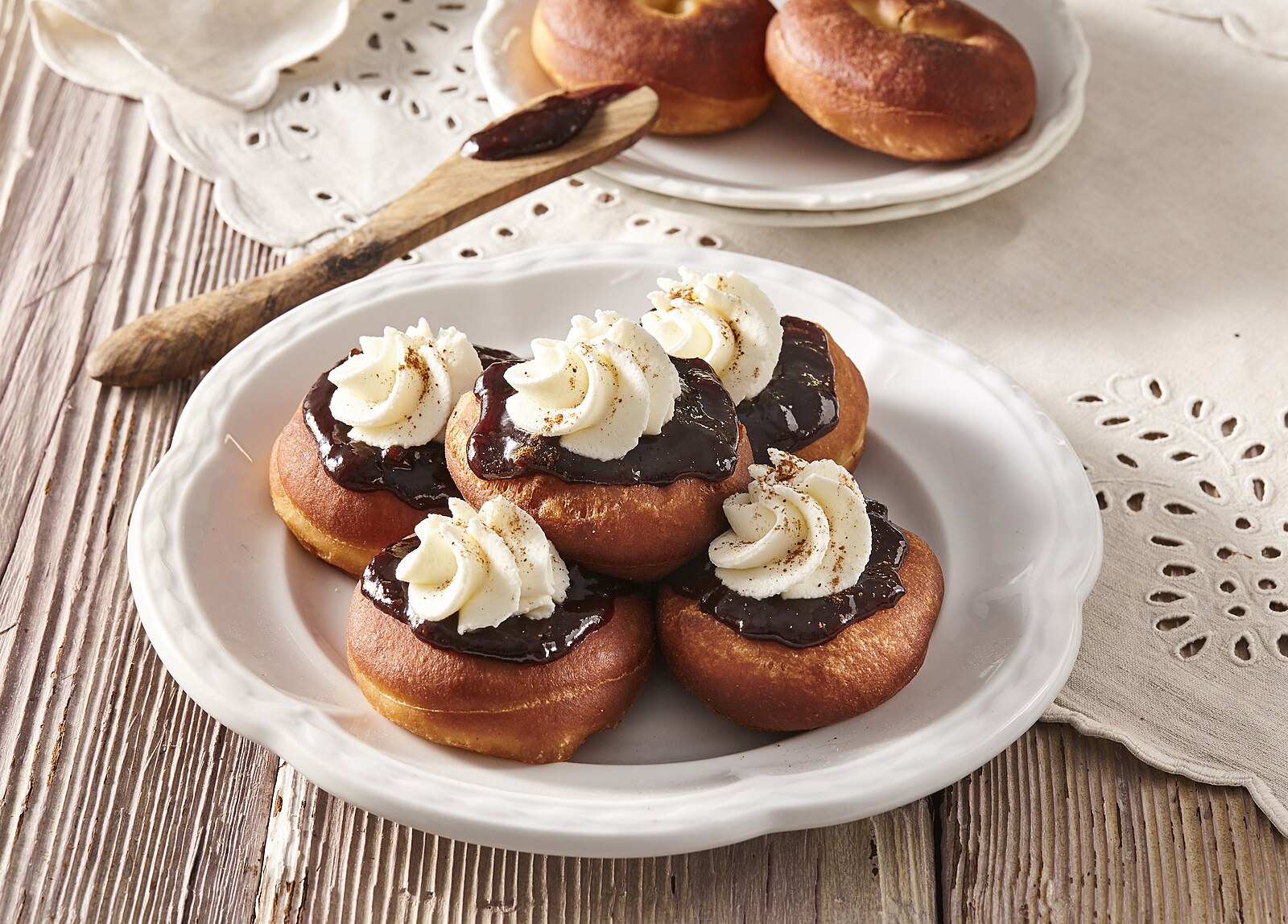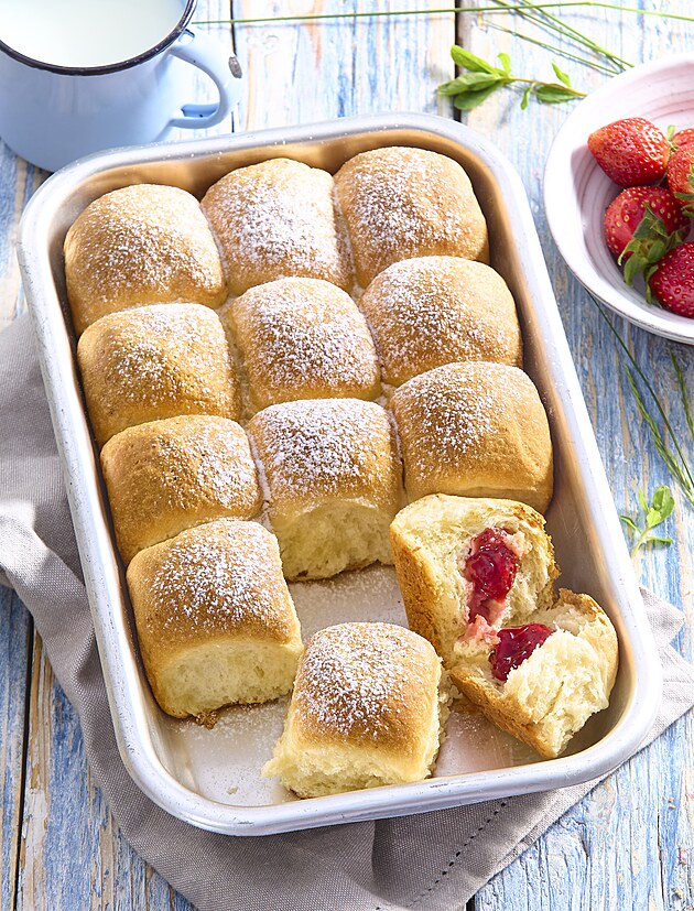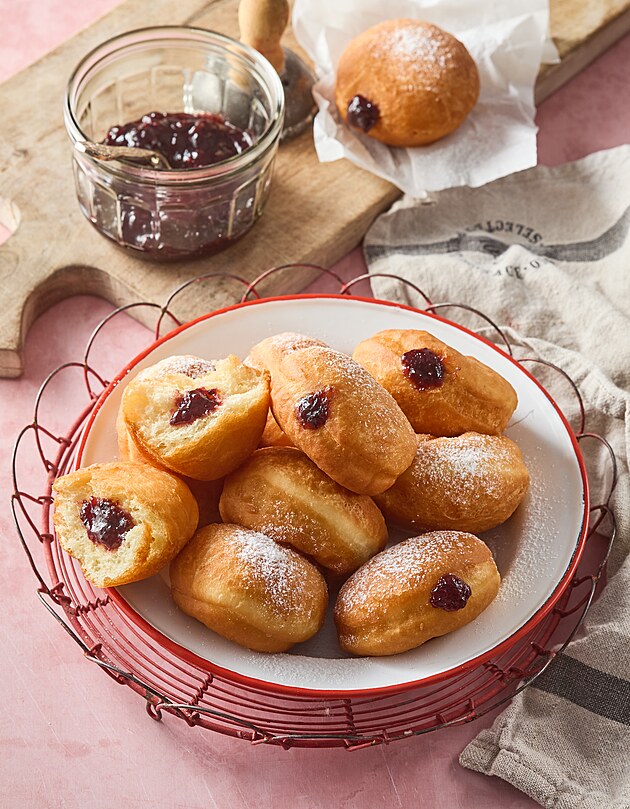 8. Toto pečivo se tradičně připravuje z kynutého těsta, které se smaží dozlatova a křupava na povrchu, zatímco uvnitř zůstává měkké, lehké a vzdušné. Nejčastěji se plní nebo polévá džemy a vanilkovým nebo čokoládovým krémem, zatímco vrch je obvykle posypán moučkovým cukrem nebo potřen čokoládou.