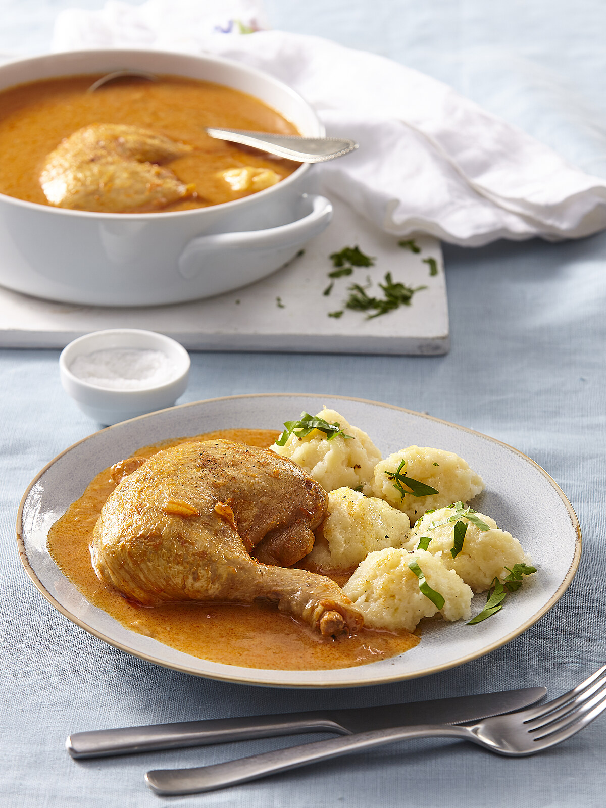 35. Kuře na paprice je česká verze slavného maďarského kuřecího paprikáše. Jídlo se skládá z dušených kousků kuřete v krémové omáčce, která je bohatě okořeněna sladkou paprikou. Stejně jako originální pokrm se i česká verze objevuje v mnoha variantách a do doprovodné paprikové omáčce přidávají pikantní rajčata nebo hustou smetanu.