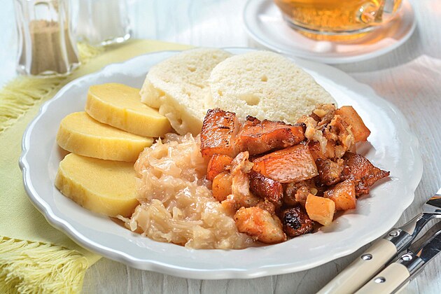23. Vepřo-knedlo-zelo, tedy vepřová pečeně s houskovými knedlíky a kysaným zelím. Vepřové maso se peče v troubě s nakrájenou cibulí a vývar z pečeně se zredukuje na omáčku, která se k pokrmu podává.