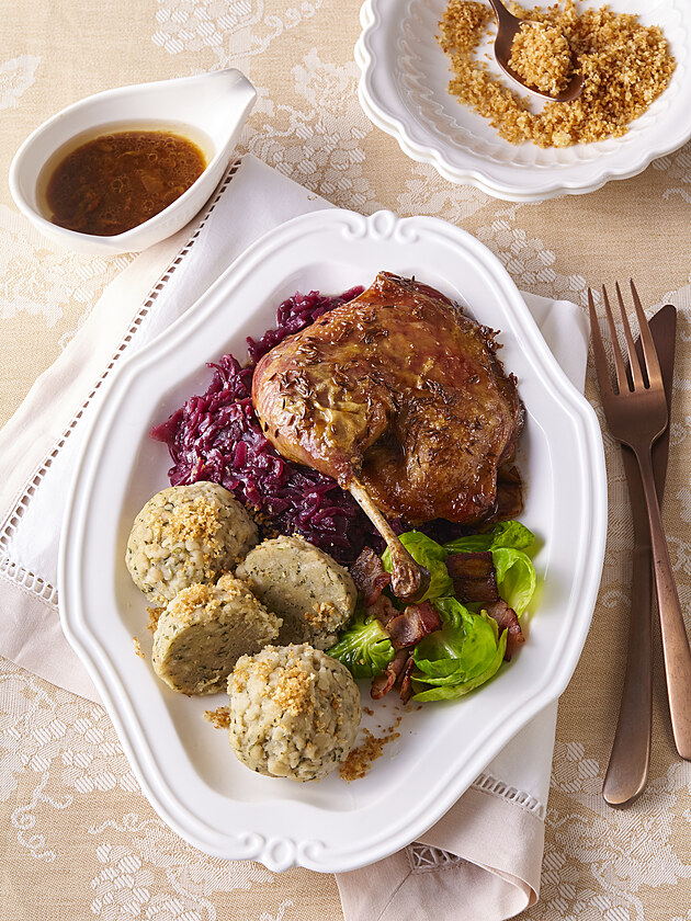 5. Kachna se obvykle ochucuje kmínem, někdy majoránkou a poté se pomalu peče v troubě dozlatova a do křupava. Tradičně se podává s bramborami, houskovými knedlíky, dušeným zelím a občas s hustou omáčkou z kachního sádla a mouky.