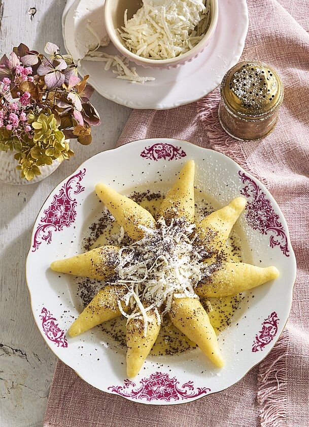 44. Bramborové šišky s mákem se skládají z bramborových knedlíků, které se tradičně posypávají slazeným mákem s vanilkovou příchutí. Knedlíky se vyznačují válcovitým tvarem a jemnou texturou, krátce se povaří a poté se podávají ještě teplé.