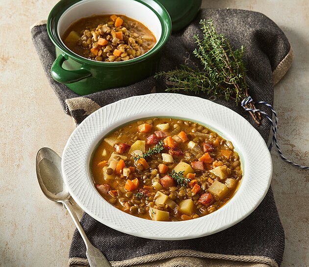 48. Čočková polévka je chutná česká polévka. Obvykle se připravuje z hnědé nebo zelené sušené čočky, kořenové zeleniny a různého koření, jako je majoránka nebo koriandr. Občas se zahušťuje moukou a pro výživnější podání se přidávají pikantní klobásy nebo uzená slanina.