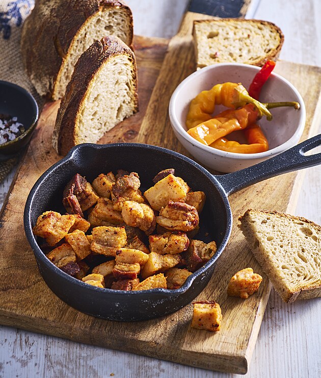 43. Škvarky jsou tradiční specialita oblíbená v jihovýchodní Evropě a na Balkáně. Tato rozmanitost vepřových kůrek nebo škvarků se obvykle vyrábí domácí tepelnou extrakcí tuku ze sádla. Sádlo se obvykle krájí na kostky a smaží se ve vlastním tuku, dokud se nerozpustí a v hrnci nezůstane tuhá a křupavá vepřová kůže.