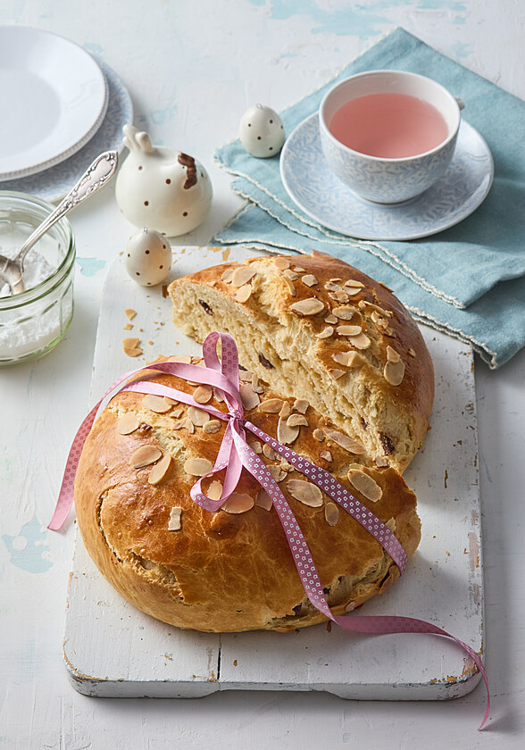 47. Mazanec je tradiční sladký velikonoční chléb, který je obohacený o rozinky, či jiné sušené ovoce (např. meruňky). Vytvaruje se do velkých kulatých bochníků, před pečením se posype plátky mandlí a nahoře je obvykle vyrytý symbol kříže.