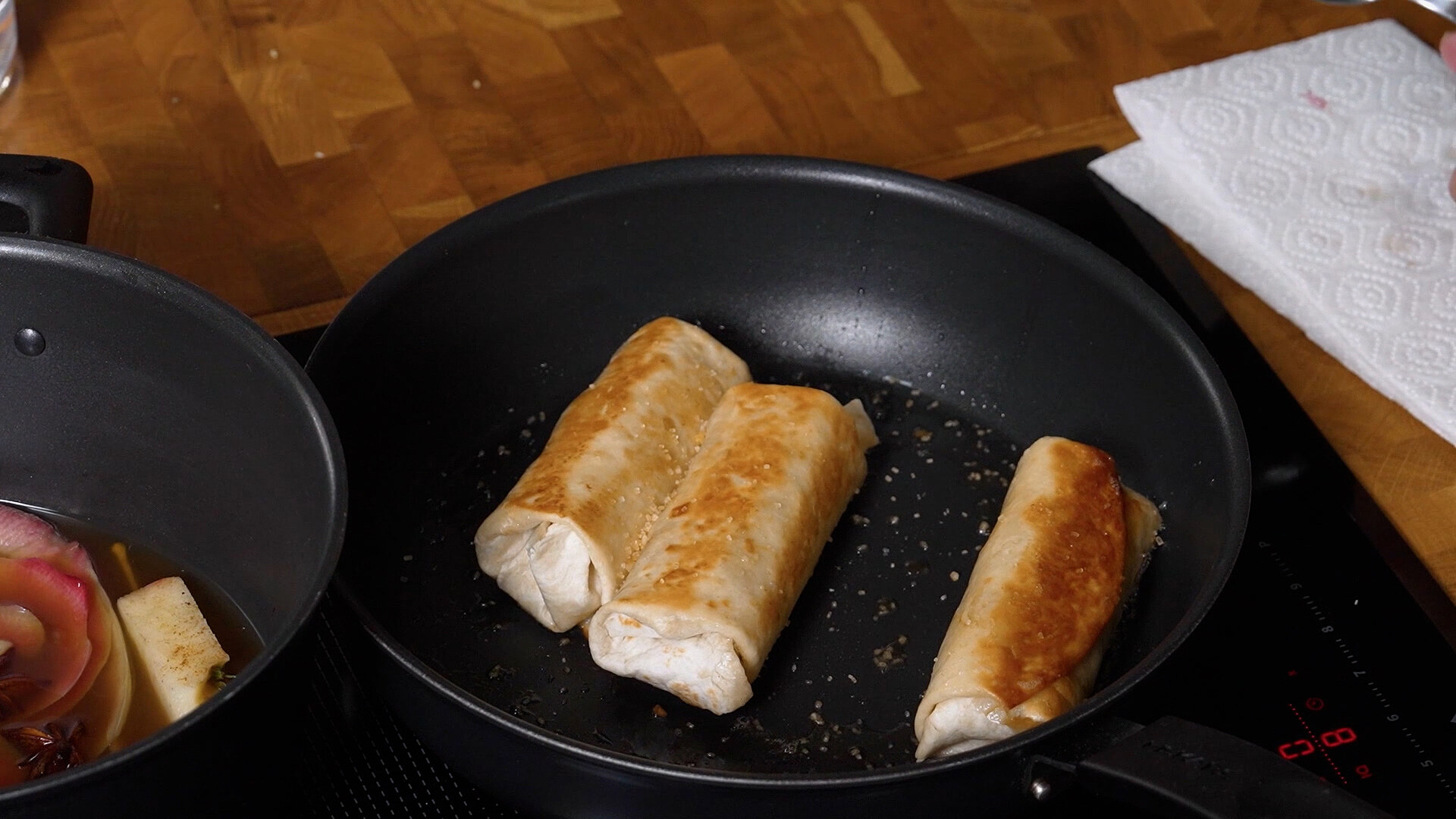 A můžete plnit a balit tortilly – na videu je krásně vidět, jak je Luboš Rychvaldský zručně balí. Zabalené tortilly pak na pánvi s trochou rozehřátého rostlinného oleje s máslem pěkně osmažte dokřupava ze všech stran. „Jako malé štrúdlíčky,“ radí sugestivně Rychvaldský. Podobná dobrota to opravdu je.